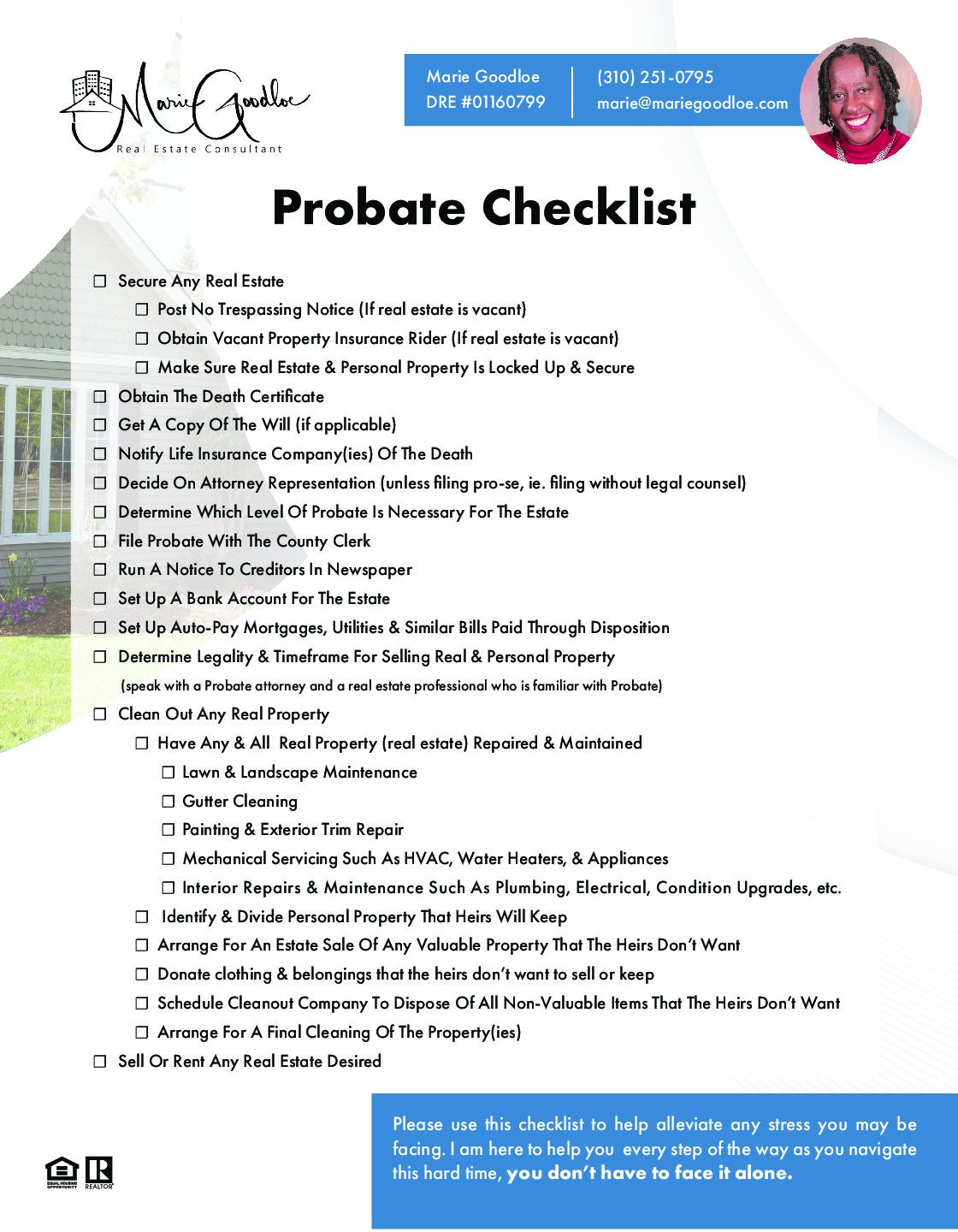 This is a checklist of some of the most common steps required when working though a probate case. While you should always consult an attorney to verify local and state laws and proceedings, this guide is an incredible resource to keep on hand.